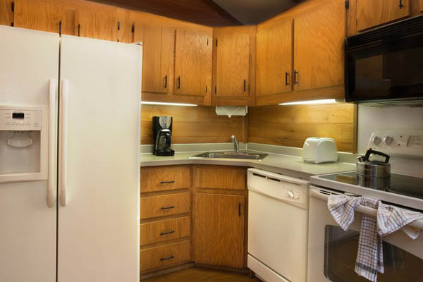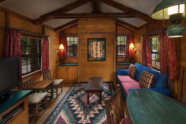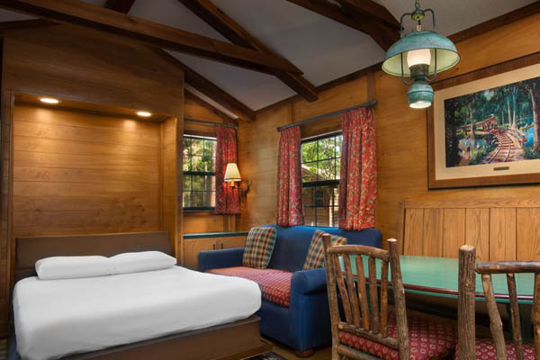 Each of the cabins, although designed to make you feel like you are roughing it, are far from missing the luxuries you expect from staying in a Disney World Deluxe Resort. Identical in size and features, the 407 cabins are about 500 square feet in size with a fully functional kitchen, a living area, bedroom with bunk beds and a double bed as well as a pull-down Murphy Bed. There is also a full bathroom with tub and shower to give you the additional option of washing the smaller children in a tub setting. Each of these cabins will sleep up to 6 people and pulling down the Murphy Bed is not a problem.