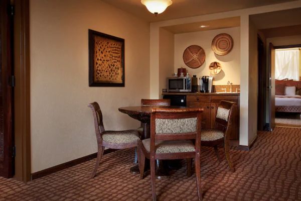 It’s a magical stay no matter where what type of room you get at the Disney Animal Kingdom Lodge but if you can swing a Suite, the One (1) and Two (2) Bedroom Suites are nothing short of amazing. Giving you so much more space than the standard rooms at the Jambo House, the One (1) Bedroom Suite is about the size of putting two of the standard rooms together. The 1 Bedroom Suites have Living Room with dining table and Sleeper sofa and the Bedroom has 2 queen beds. Add in the 2 bedroom Suite and you have enough space to sleep up to Eight (8) guests. Suites are not inexpensive but can be a nice option if you really want (or need) the additional space.