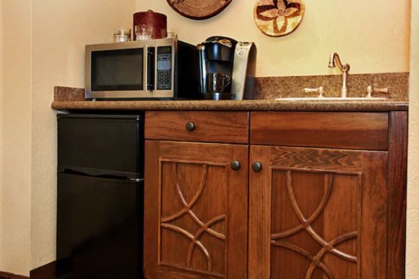 Each of the One (1) bedroom suites at the Disney Animal Kingdom Lodge offer about twice the square footage as a standard room. The Living space comes complete with a sleeper sofa, table, two chairs, dining table and wet bar. The bedroom space has two (2) queen beds and the bathroom has a double vanity, tub and separate stand-up shower unit.
