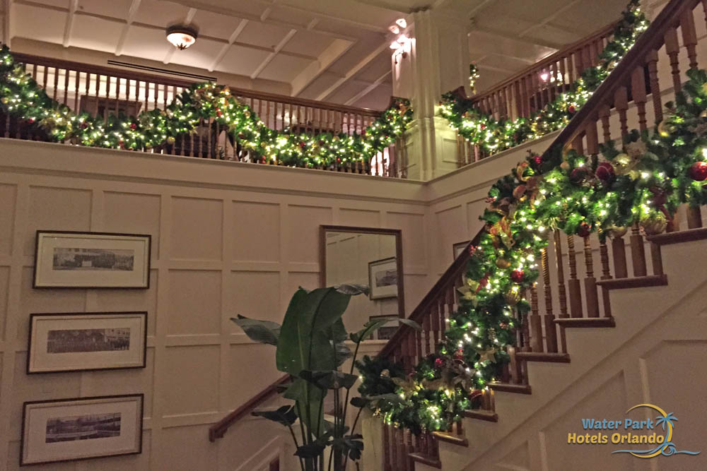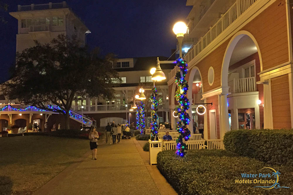 The huge garland wrapped banisters around the main lobby of the Disney Boardwalk Inn really make it shine int he Holiday season. Garland is also hung with care above the mantel of the huge fireplace giving that special, cozy family Christmas feel to your vacation. Multiple Christmas trees are displayed inside and there is also a large Tree decorated with ornaments and color lights outside in the main courtyard. Garland wrapped boardwalk lights line your walking path giving you the sights and sounds of Christmas no matter where you go.