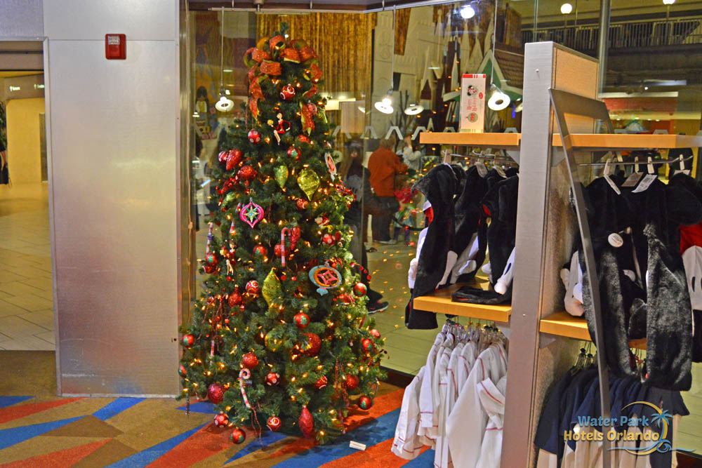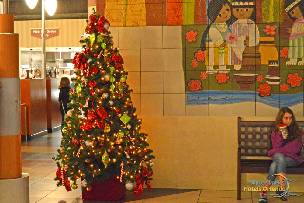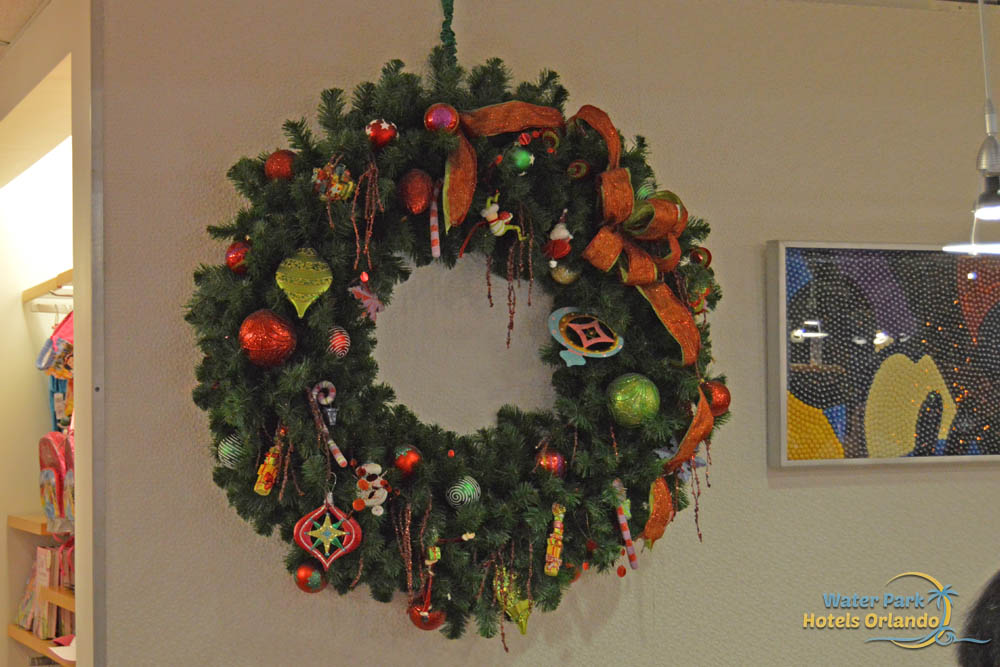 Once inside the main lobby area, you will see many different Christmas Trees decorated in various styles and sizes. Garland is also hung with large Christmas wreaths at many different locations throughout the resort.