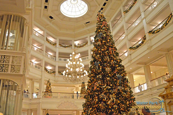 One of the largest indoor Christmas trees you will find in Disney World is right in the center of the Disney Grand Floridian lobby. Nearly 40 feet tall, this grand Christmas tree is ornamented with numerous uncommon lights and ornaments to give it that early 1900's elegant style. The Christmas Tree has a more classic feel and does not have all of the childlike features you might find at other Disney Resorts. The Grand Floridian has a Victorian style all the way around so the decorations have to fit. At various times during the day, you have the honor of listening to some amazing Christmas and Festive music played from the band perched upon the 2nd floor of the Disney Grand Floridian. The first time you hear is, you wonder where all of the fantastic music is coming from, once you realize that it is "live" music, it is worth taking a closer listen. There are many other Trees on the main floor but you will also see them spread out on the other levels as well.