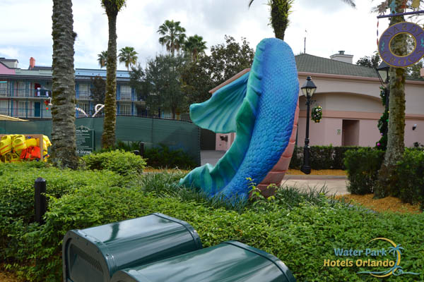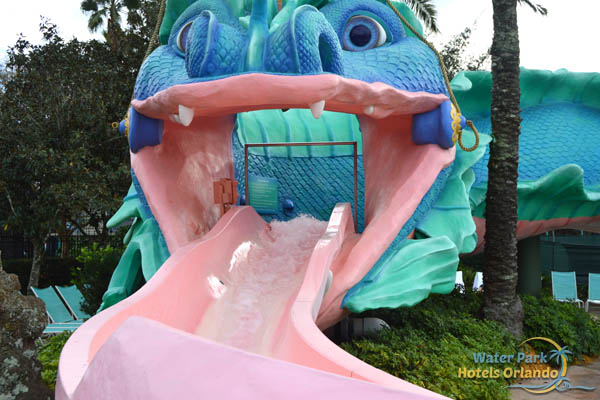 Walking out of the back of the French Quarter Lobby, a few happy alligators meet you to play a jazz tune as you walk the path to the Family Pool. A colorful serpent can be seen from a distance due to its massive size and it slithers along the pool inviting guests to join in the fun. The arches of the beast act as bridges and underpasses to add to the fun of getting around the Doubloon Lagoon. A water slide is built into the mouth of the