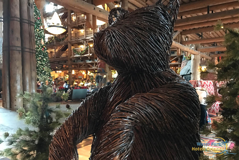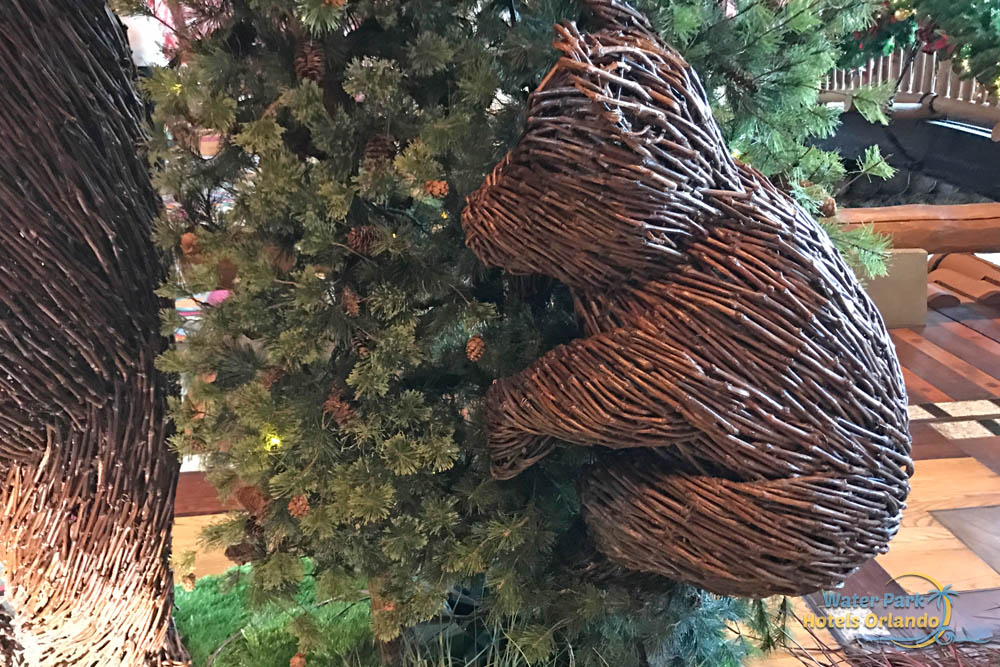 While most of the Disney World Deluxe Resorts have a Gingerbread Display, the Disney Wilderness Lodge has something a little different. In the lobby, near the bridge in the back, you will find a display of 3 wicker bears in a fun and unique display. Kids love to see the bear clutching to the tree and this is a great spot for that one of a kind Christmas photo.