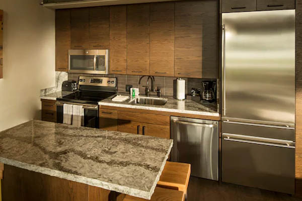 - Kitchen: Refrigerator, Stove, Dish Washer, Coffee Pot, Sink, Counter, Microwave