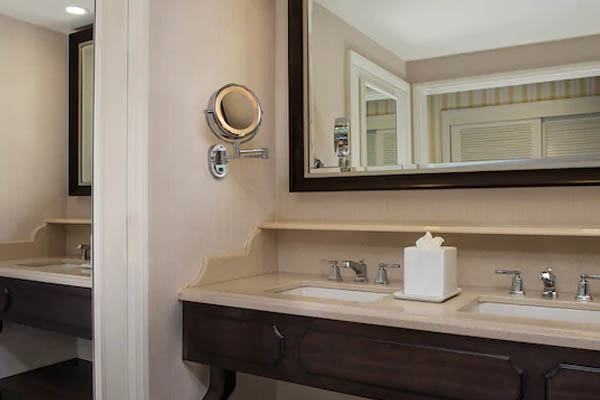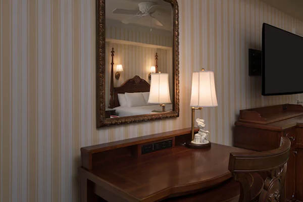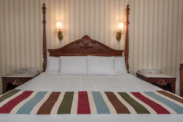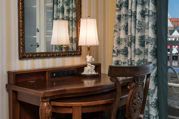 The rooms at the Disney World Boardwalk Inn have an elegant style about them with large wooden headboards, stylish wallpapers, and crown molding. Blend in the carpets, and you end up with a tie into a more authentic charm seen in the 1920’s era. Each room also comes with its own private balcony or a patio if you get a room on the ground floor.