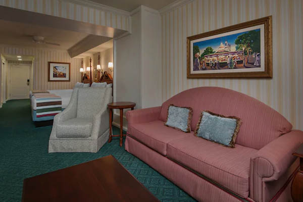 Deluxe Rooms at the Boardwalk Inn are quite a bit larger than the Standard Rooms having about 644 Square Feet of space. Deluxe Rooms also give you enough space to add one more guest. Staying in a Deluxe Room at the Disney Boardwalk Inn accommodates 6 guests per room. All of the Deluxe Rooms are really long and have a small wall partition that separates the Living and Bedroom area. Deluxe rooms do not give you a private bedroom like one of the 1 or 2 Bedroom Villas but they do give you two main sections. The Bedroom consists of 2 Queen beds a table with chairs, a flat-screen TV and a desk while the Living room has a sleeper sofa and chair, a small desk and another flat-screen TV. Each room has a private balcony with seating to enjoy the water or resort views.
