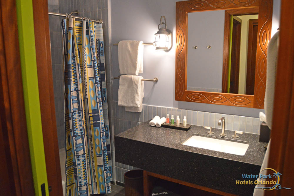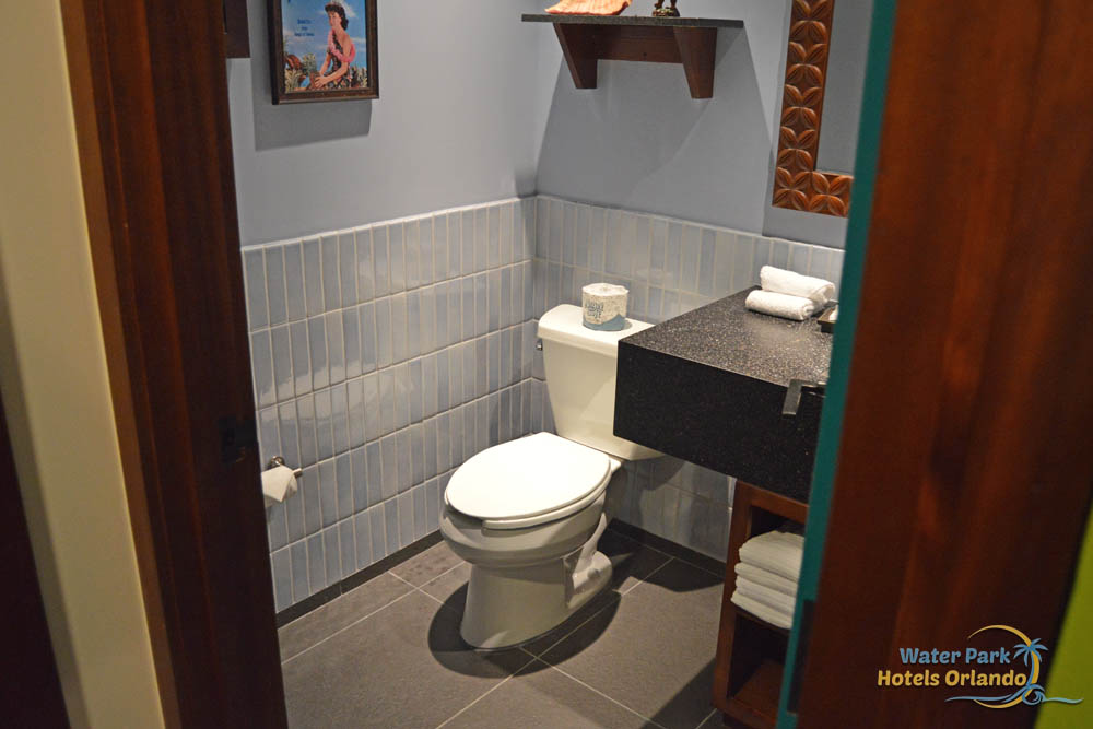 The Second Bathroom does not connect with the 2nd Bedroom because it is used for all of the other guests in the Bungalow. Because of this, it is more centrally located down the hall near the living area. Disney has done a great job of giving multiple spaces to get ready and with 8 people staying in one of these Island Houses, it is a good thing. The second bath is sectioned off in two main spaces. As you walk in, you will notice a door leading to the toilet and sink area and to the left you open into the tub/shower unit and another granite top sink. This makes it easier when trying to get started with your day.