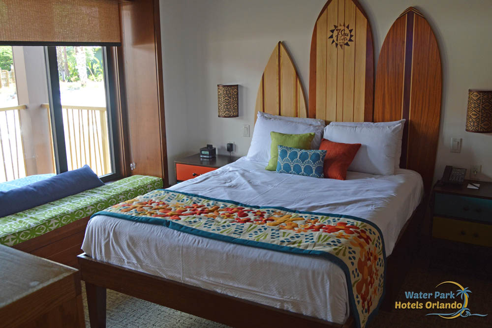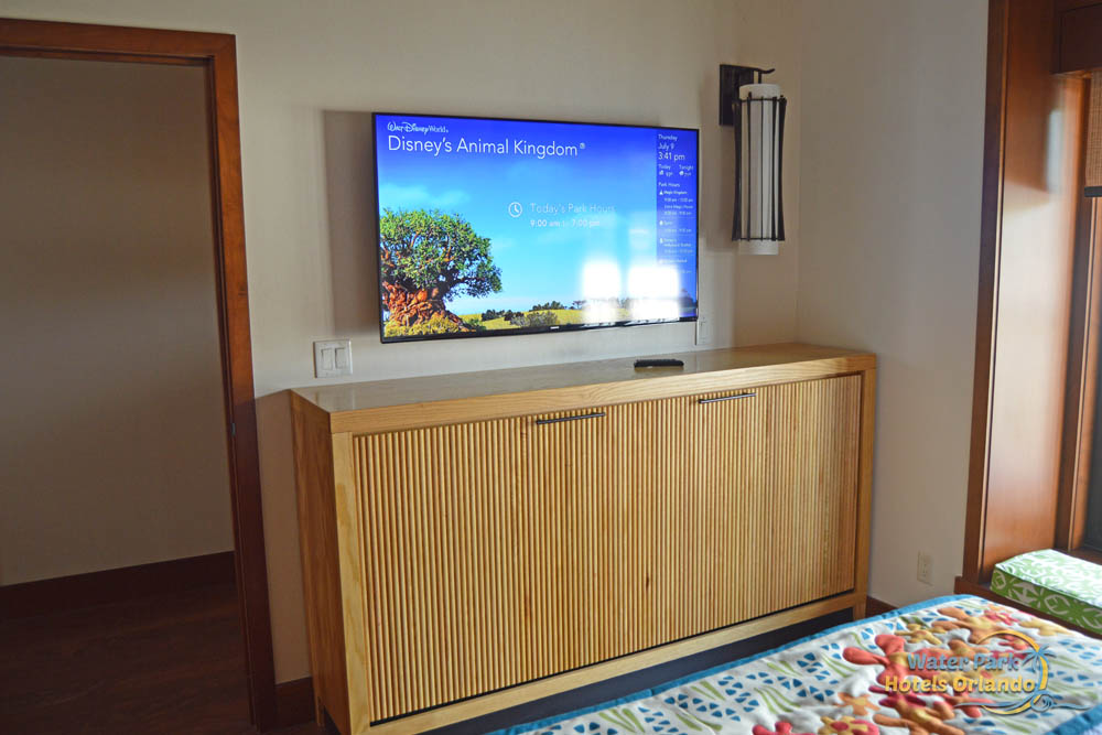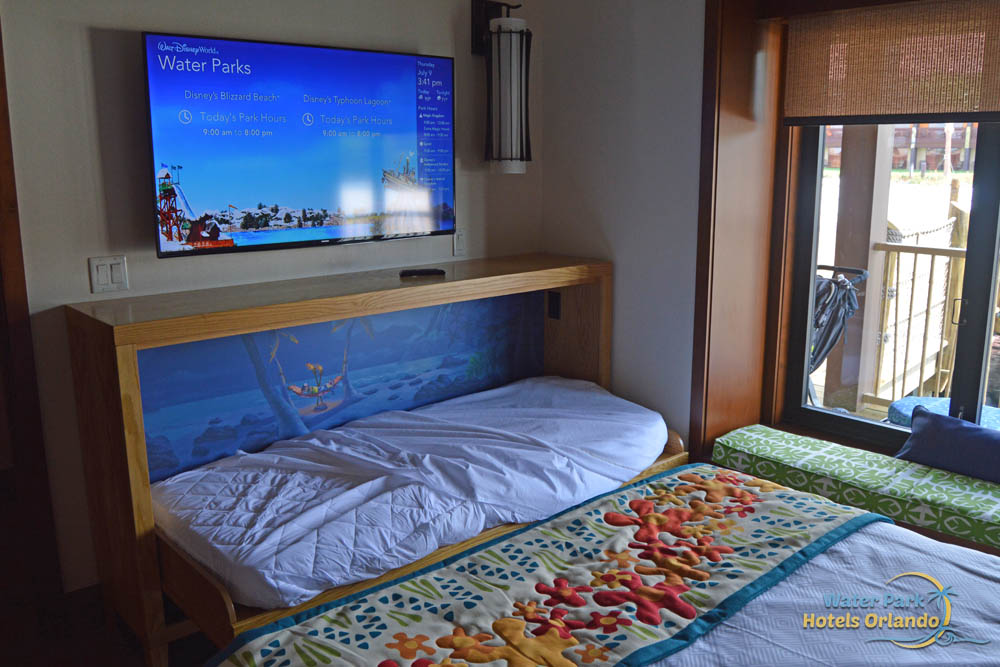 The 2nd bedroom has a single Queen size bed made with 3 surfboards as the headboard giving this bed the most island feel of them all. To add more bedding, you will also find a twin pull-down Murphy bed on the other wall opposite of the Queen bed. As you pull down the twin bed, you will see a beautiful mural painted in the background. Pay attention to the detail as it is quite beautiful and the kids love these little extras found within the Bungalows at the Polynesian Resort.