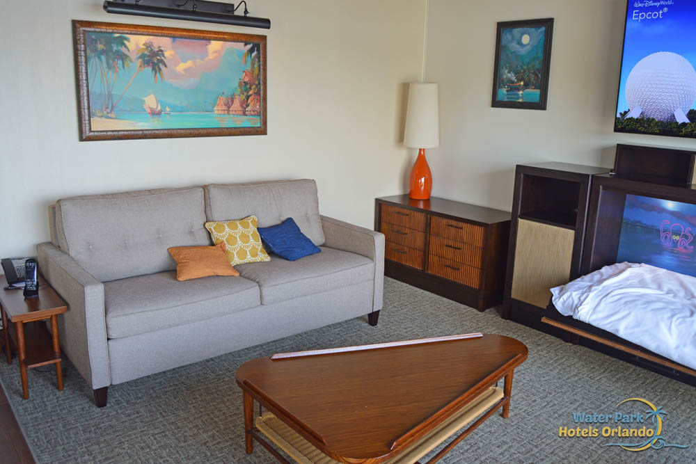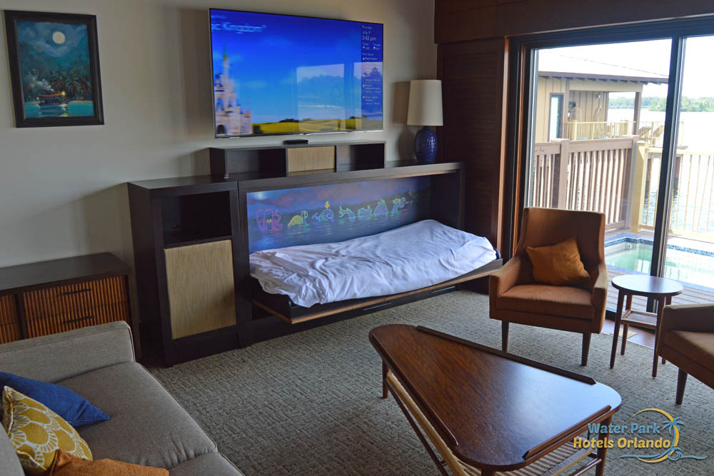 The main living area is the most generous in the Bungalows. This living area has an island feel with large tropical, Disney-style artwork on each of the walls. The main wall is filled with a big flat-screen TV. A queen size sleeper sofa takes up space on another wall and one of those unique twin Murphy beds is located directly under the TV. Two more chairs have been added to this space to give ample seating to the room.