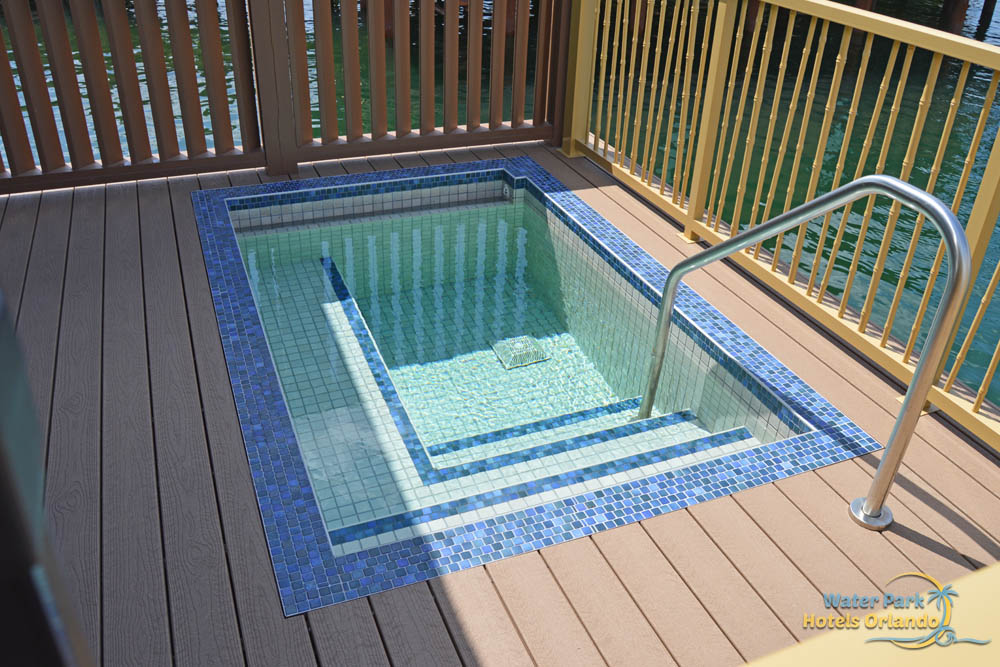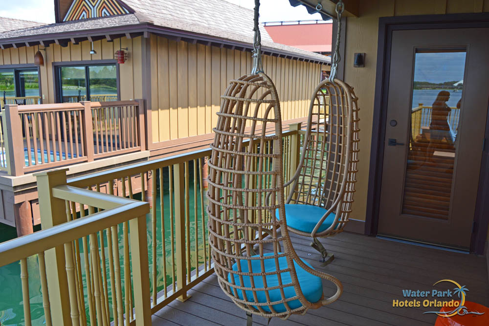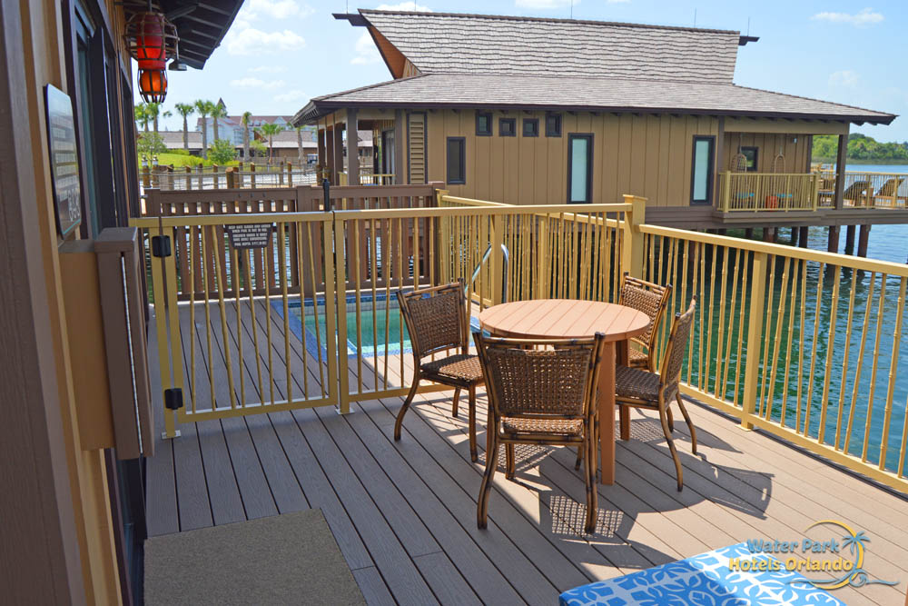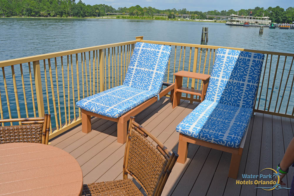 The Polynesian Bungalows are built over top of the Seven Seas Lagoon so it makes a lot of sense to have plenty of outside space to enjoy the water and watch the boats as they travel by. Included with each of these homes is about 300 square feet of decking devoted to each Bungalow. There are multiple access points to the outdoor area and the entire deck wraps around the side and back of the building. From the Master Bedroom, you get to walk out to a couple of comfortable, hanging chairs while walking out of the living space, you have a couple of Lounge chairs and even a Plunge Pool to keep cool. Unlike the "real" bungalows in Bora Bora, you cannot get in the water of the Seven Seas Lagoon from your deck.