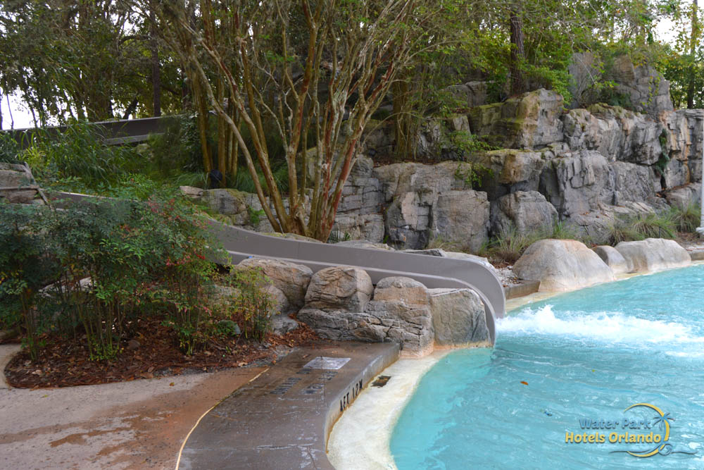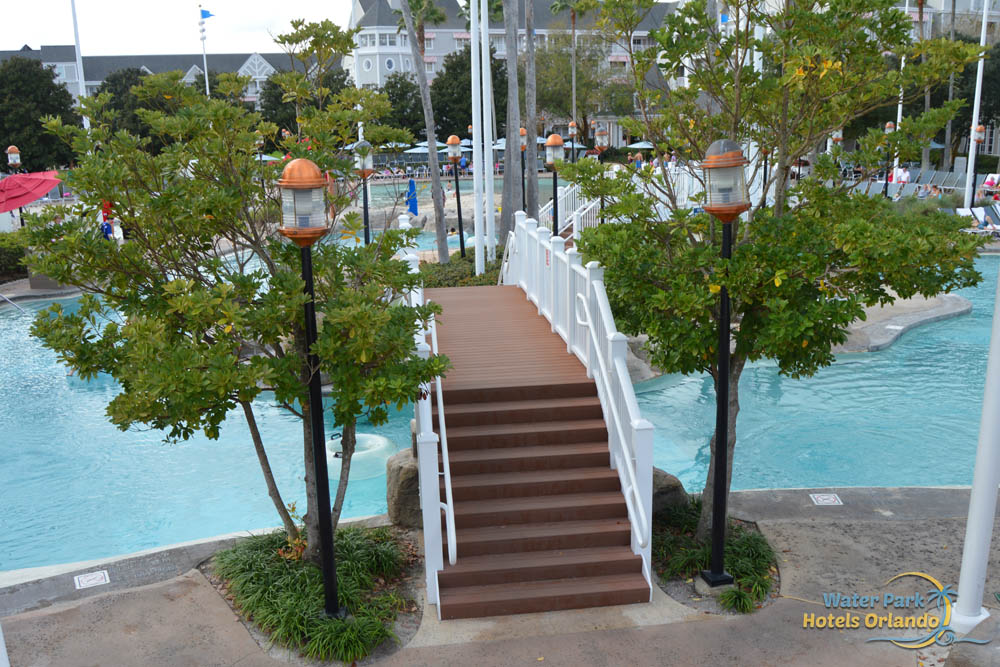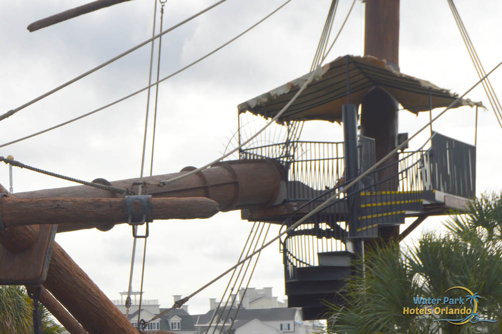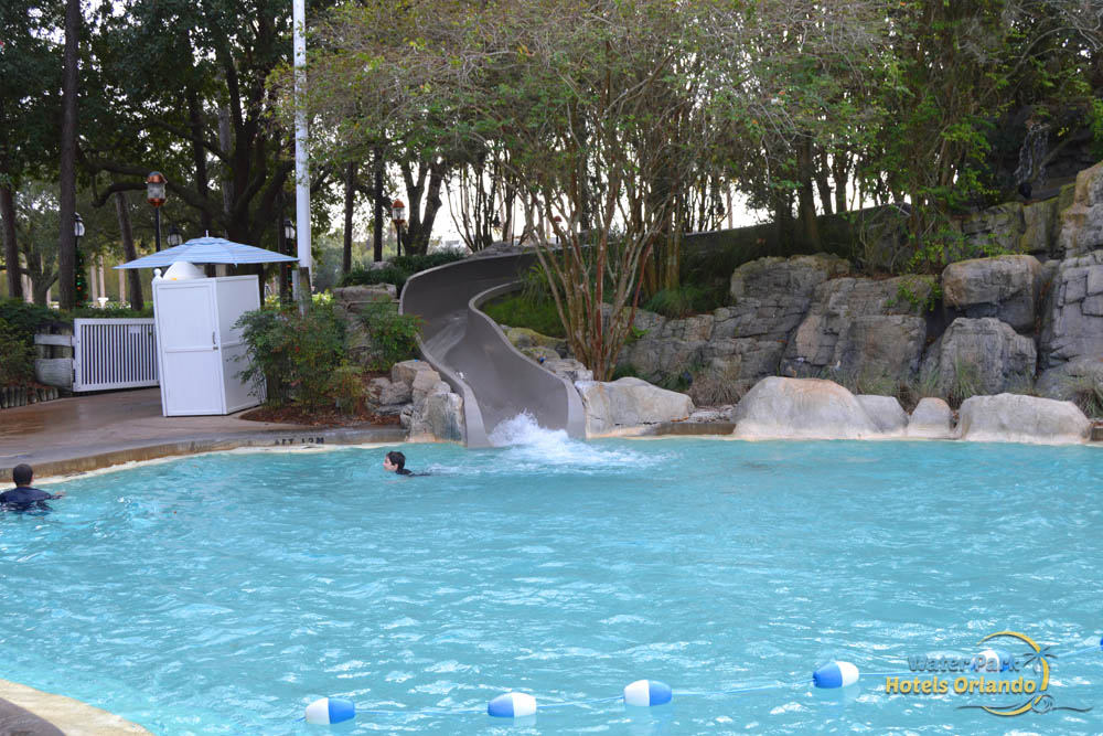 The Water Slide at Stormalong Bay is the longest at any of the Disney World Resorts. This 230-foot behemoth starts at the top of a pirate ship mast. and is enclosed while slipping over the walkway underneath. The water slide opens up to a flume on the second section and leads you to the splashdown area in the pool where lifeguards are always on duty to keep an eye on your safety.