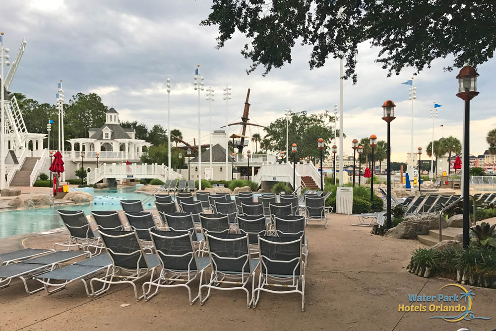 There are plenty of lounge chairs around the 3 pools, lazy river and water slide that make up the Stormalong Bay Water Park Disney World.
