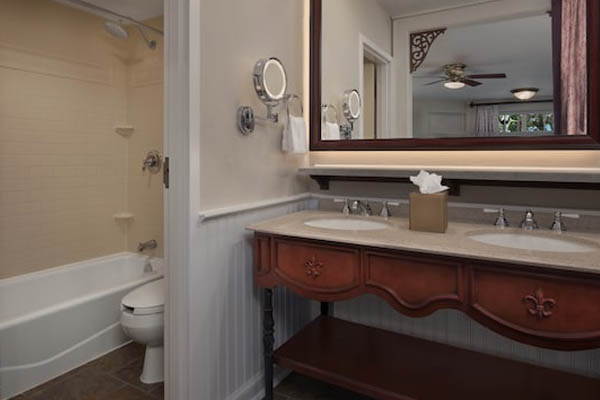The Disney’s Port Orleans Resort – French Quarter Rooms are simple, yet elegant in style. Each room is 314 square feet and a quite a bit larger than the standard rooms at the Disney World Value Resorts even though looking at them, the layout is pretty much the same. Choose from the two Queen Beds or a Single King and sleep up to four (4) guests with views of the Family Pool, or Garden. Each bathroom has ample space with a double sink vanity and a separate space for the toilet and shower behind a closed door.