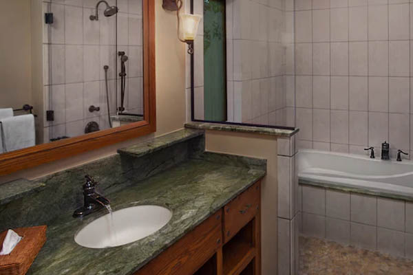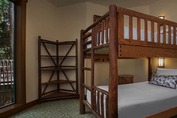You are going to be amazed at the style and luxury of these Treehouse Accommodations. Entering the Forest area, by Disney Vacation Club Way, you first notice that the Treehouse Villas are more secluded than any of the other Villas. As you walk in your Treehouse Villa, you are in for a big surprise. Even after seeing the pictures, it really does not prepare you for the amount of space you will share and the high level of style you will be living in during your stay. With the first step taken inside, you will first notice the openness of the Kitchen and Living Area. The full-size kitchen is first-rate with Granite Counters, a bar area with 3 bar stools and all of the Kitchen items you will need to prepare any type of meal. A large dining table with 6 Chairs add to your dining space and can also be used for family fun, playing games together. Each of the Treehouse Villas has the ability to sleep up to 9 guests. The Master Bedroom has a Queen Size Bed, Flat-screen TV and a Desk, the 2nd bedroom has another Queen Bed, and the 3rd Bedroom has twin bunkbeds. The additional three (3) sleeping spaces are found in the Living Area with a Queen Sleeper Sofa and a Twin Sleeper Chair. This gives plenty of space for everyone to get a great night’s sleep and take on each of the fun-filled days at the Theme Parks.